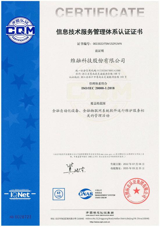 信息技術服務管理體系CQM認證證書