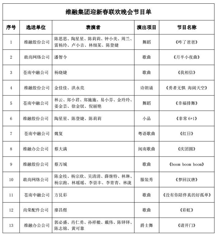 隨著2017維融集團迎新春聯歡晚會進入倒計時,與之相配套的集團、分公司、子公司都在緊鑼密鼓地進行節目排練。下面,就讓小編來劇透下,看看今年集團晚會有哪些精彩吧!
