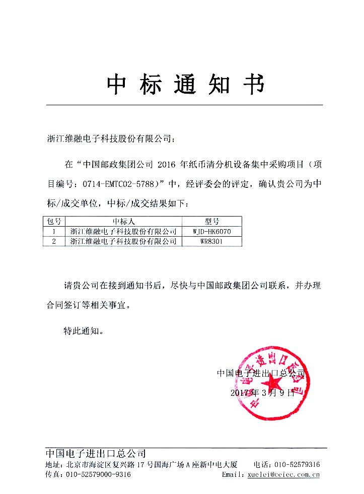 近日,我公司收到中國(guó)電子進(jìn)出口總公司發(fā)出的《中標(biāo)通知書》。在中國(guó)郵政集團(tuán)公司2016年紙幣清分機(jī)設(shè)備集中采購(gòu)項(xiàng)目(項(xiàng)目編號(hào):0714-EMTC02-5788)中,經(jīng)評(píng)標(biāo)委員會(huì)的評(píng)定,確認(rèn)維融科技股份有限公司為中標(biāo)單位,入圍產(chǎn)品為1+1口紙幣清分機(jī)、2+1口紙幣清分機(jī)。